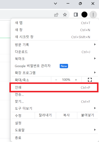 2. 우측 상단 점 세개 클릭 후 '인쇄' 클릭