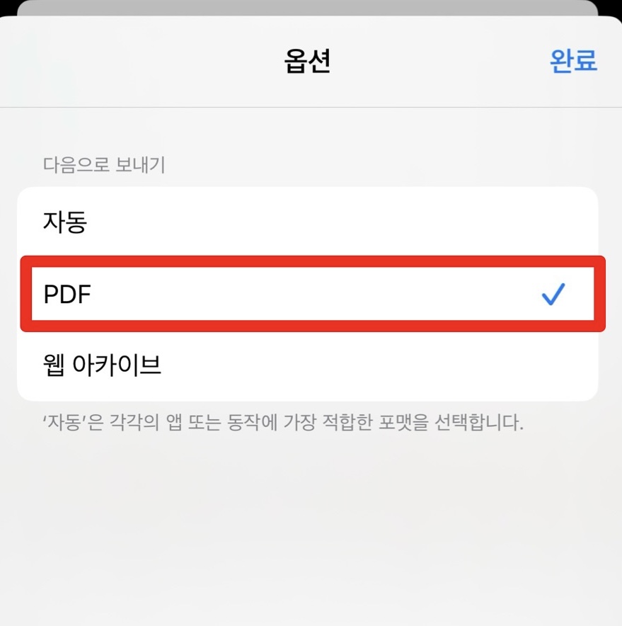 2. '옵션' 항목에서 파일 형식 PDF 클릭