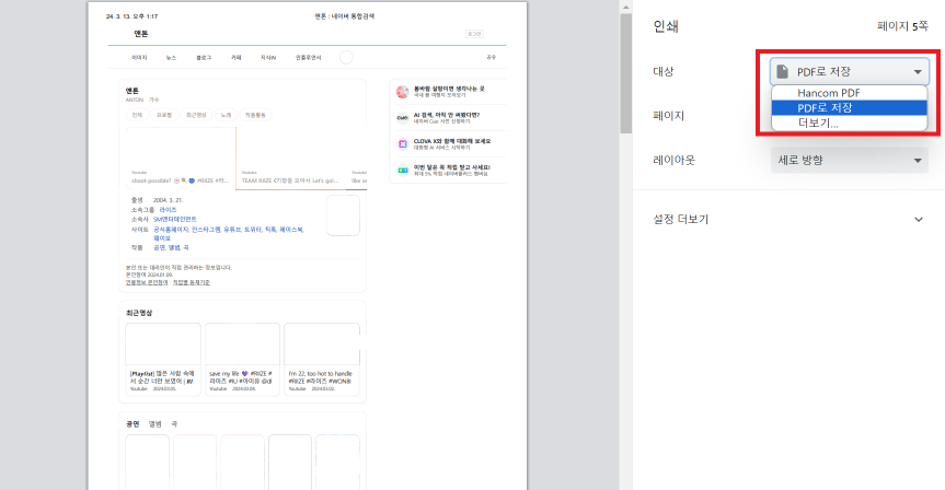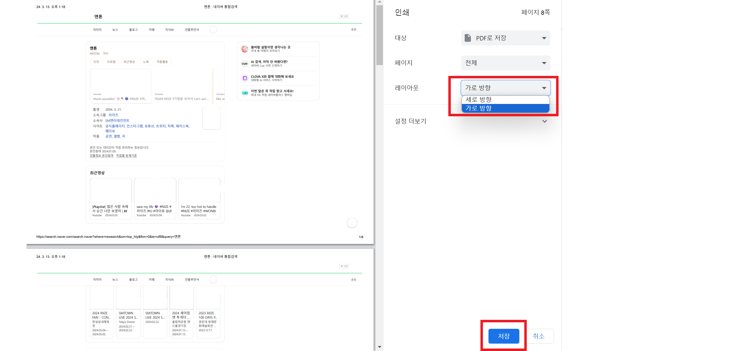 3. PDF로 저장 클릭, 레이아웃(원하는 방향으로) 선택 후 저장